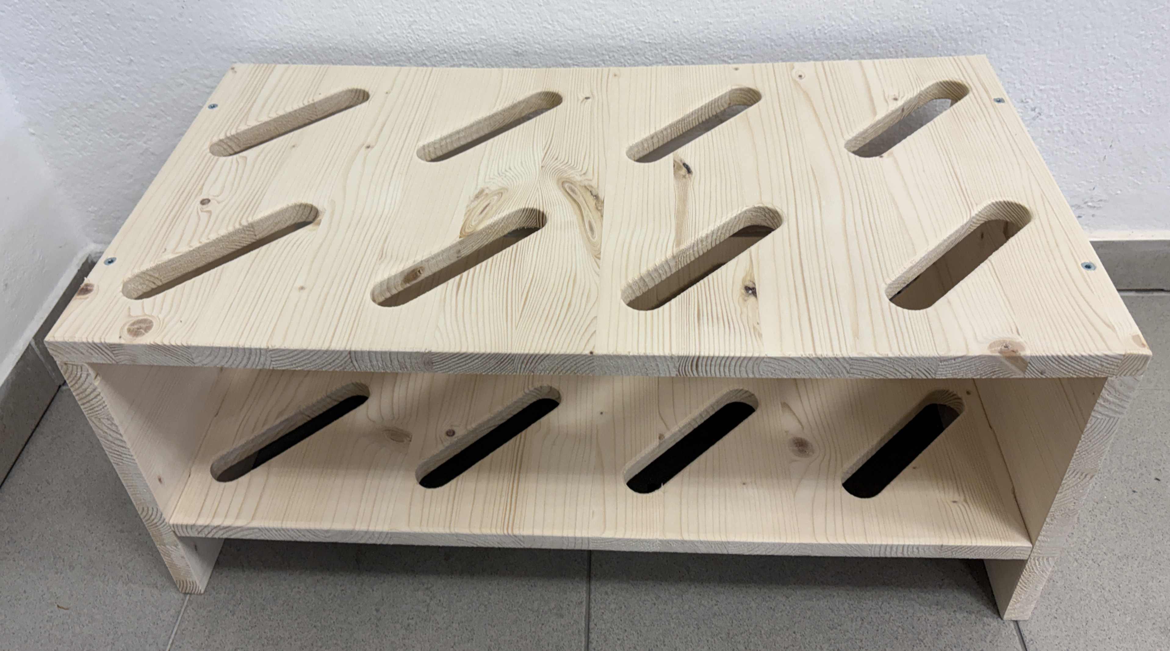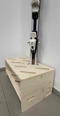 • Prostran: Stalak je namijenjen za 8 pari skija. Dimenzije otvora su 13 x 2,7 cm. Na zahtjev je moguće izraditi i veće otvore. Preporučujemo da skije točno izmjerite. Za šire skije otvore možemo prilagoditi prema vašim željama.