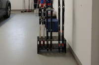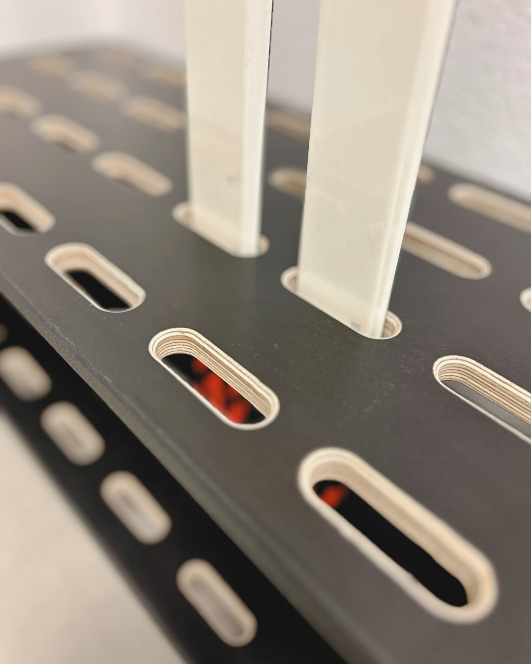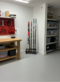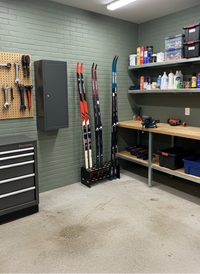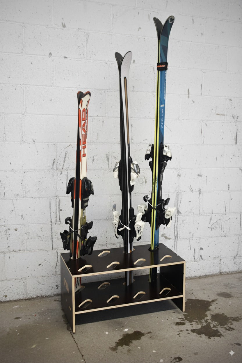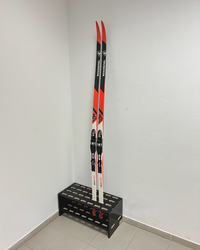 - Prostorno: Vsaka odprtina je namenjena enemu paru tekaških smuči. Stojalo je primerno za 14 parov tekaških smuči. Najpogostejša širina smuči pri peti je 40–48 mm, zato brez težav ustrezajo odprtini velikosti 55 x 16 mm.